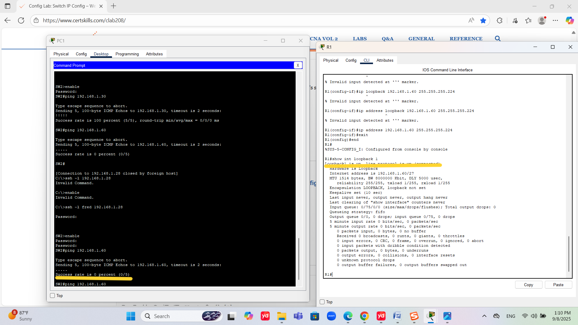 2) I tested your scenario by downloading the file, opening it, copy/pasting the SW1 and SW2 config into those devices. Then I added the two commands for the R1 loopback per the lab – interface loopback 1 and ip address 192.168.1.60 255.255.255.224. At that point, I moved back to the SW2 console and *ping 192.168.1.60* worked. So, maybe you could do the same, save that .pkt file as another filename (maybe append a -V2 to the end), and compare your original file’s config to this new one, and figure out what you did differently.