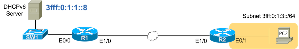 The examples below show the beginning configuration state of R1, R2, the DHCPv6 server, and the PC (a router).