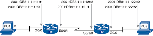 For instance, Figure 2 shows a diagram of a small network, with global unicast IPv6 addresses listed. Just like with IPv4, a network diagram with IPv6 addresses listed implies that the addresses are some type of unicast IPv6 address. They could be global unicasts, unique locals, or even link locals, depending on the purpose of the figure.